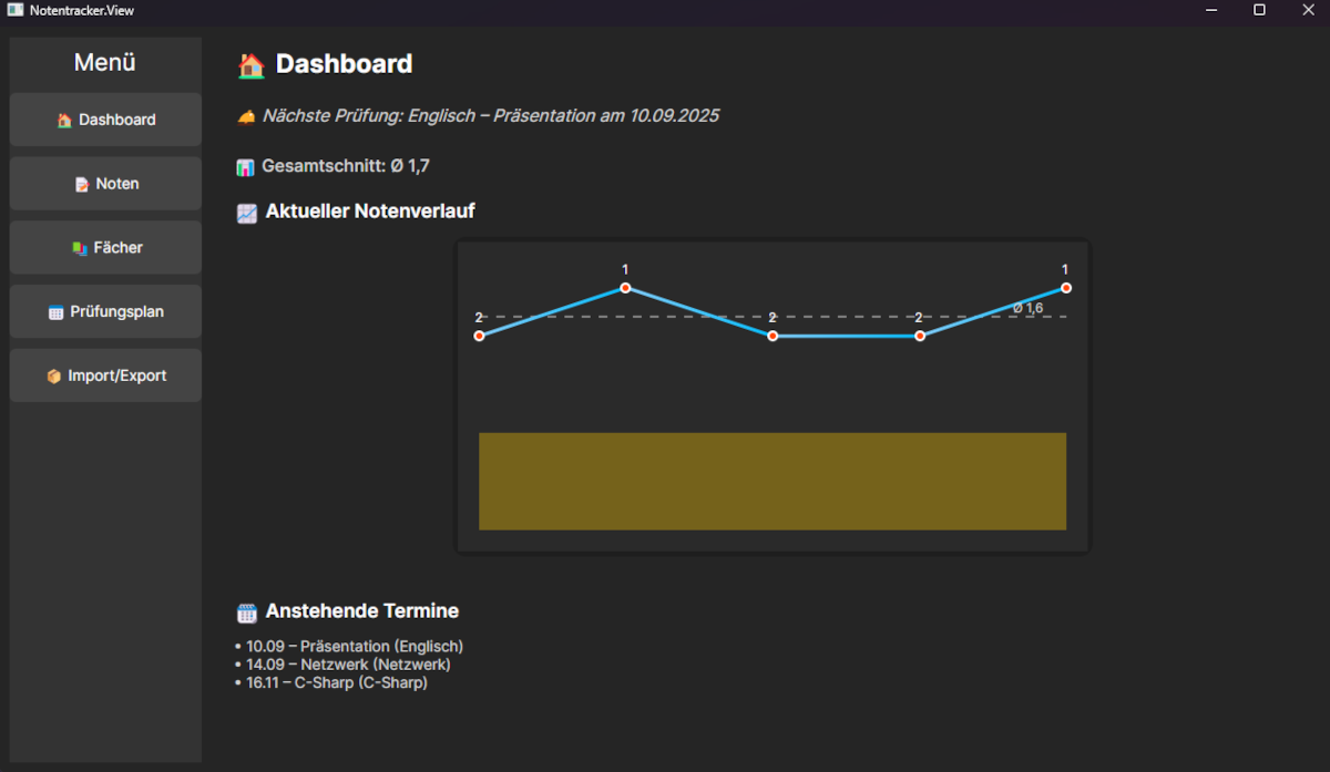 View on GitHubA C# desktop app built with Avalonia UI and MVC to track grades, exams and subjects, created in my second semester of vocational training.