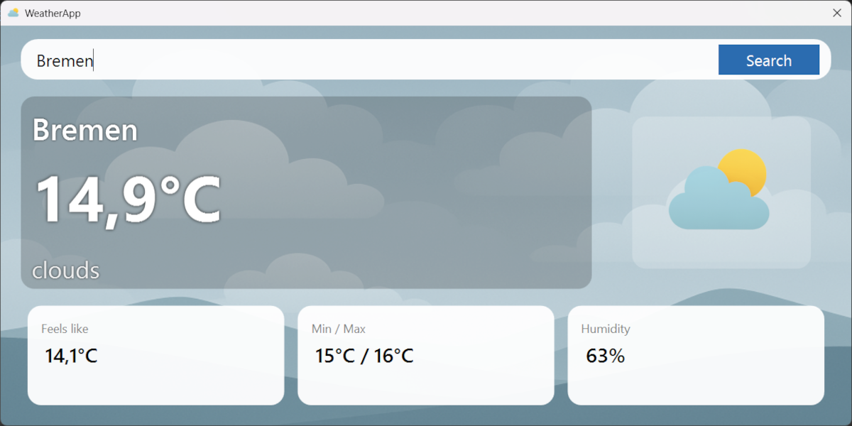 View on GitHubA WPF app consuming the OpenWeather API to show current conditions, including dynamic backgrounds based on weather.
